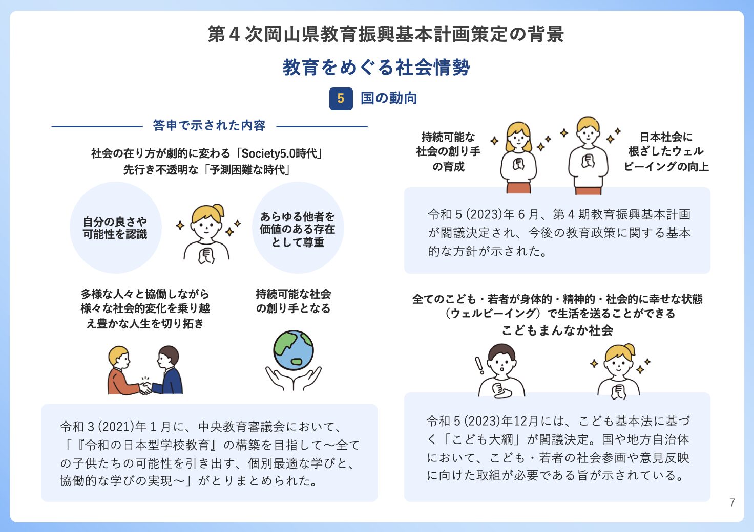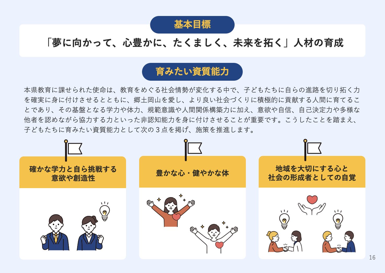 本計画は、令和7年度から4年間にわたり岡山県内の教育の方向性を示すもので、「夢に向かって、心豊かに、たくましく、未来を拓く人材の育成」を基本目標に掲げています。